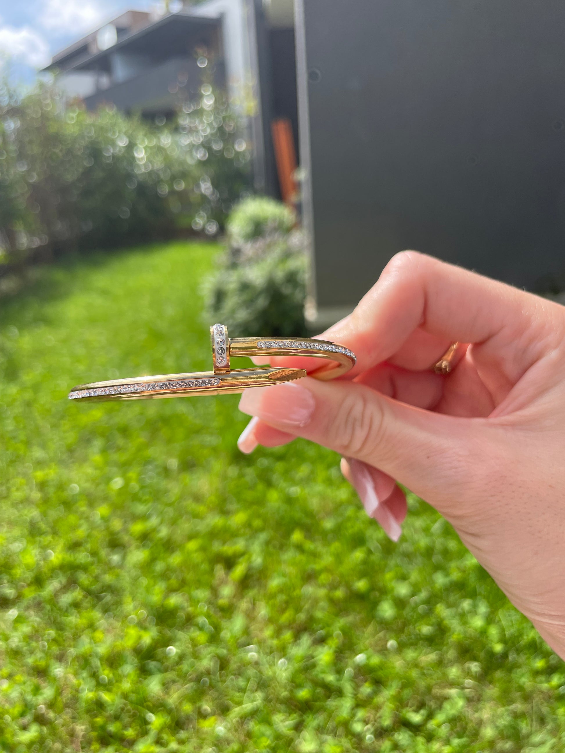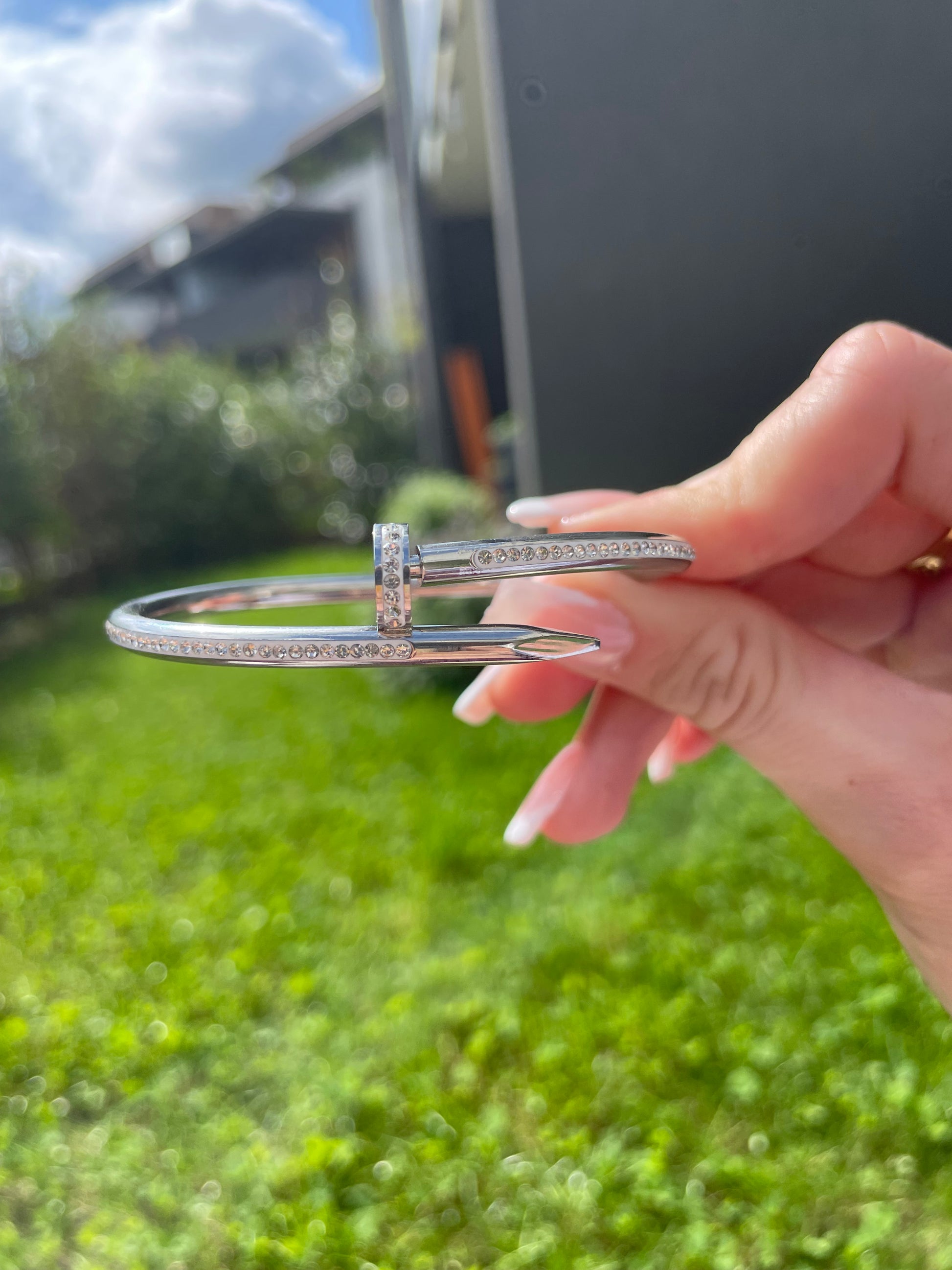 Le jonc Artemis, disponible en doré ou argenté, est un bijou non réglable au diamètre de 5 à 6 cm, adapté aux poignets de taille moyenne. En acier inoxydable, il est délicatement parsemé de strass en zirconium pour un éclat raffiné.